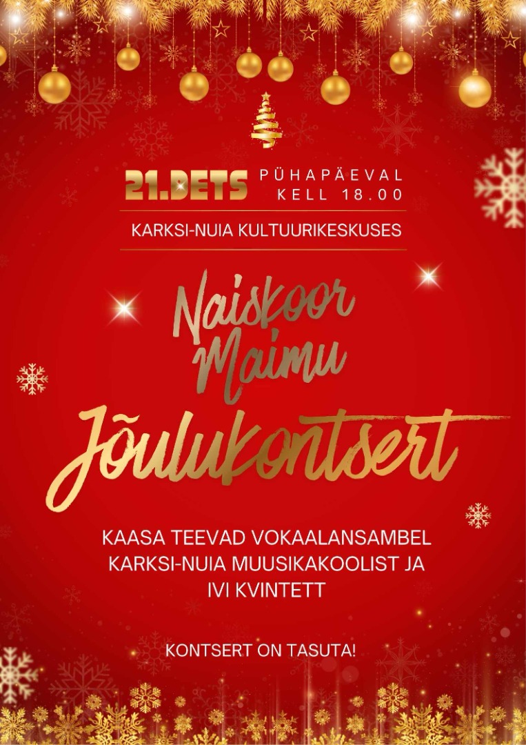 Detsember 2025EelmineJärgmine 04.12.202518:00Karksi mälumäng 06.12.202509:00-15:00Jõululaat 06.12.202509:20-12:00Jõulukuuskede kaunistamise konkurss 07.12.202516:00Jõulujazz - II advendi kontsert 08.12.202518:00Karksi-Nuia Muusikakooli Talvekontsert 09.12.202500:00Puuetega inimeste jõulupidu 10.12.202516:00Koduste laste jõuluetendus 13.12.202500:00Karksi-Nuia Jõulupidu 16.12.2025 - 18.12.202500:00AKG bronn 18.12.202519:00"Sõnade seemnest tärganud", August Kitzbergi 170. sünniaastapäevale pühendatud etendus 19.12.202512:00Eakate jõulupidu 21.12.202518:00Naiskoor Maimu jõulukontsert EelmineJärgmine• Sündmuste kalender• Sündmuste arhiiv• Sündmuste RSS
