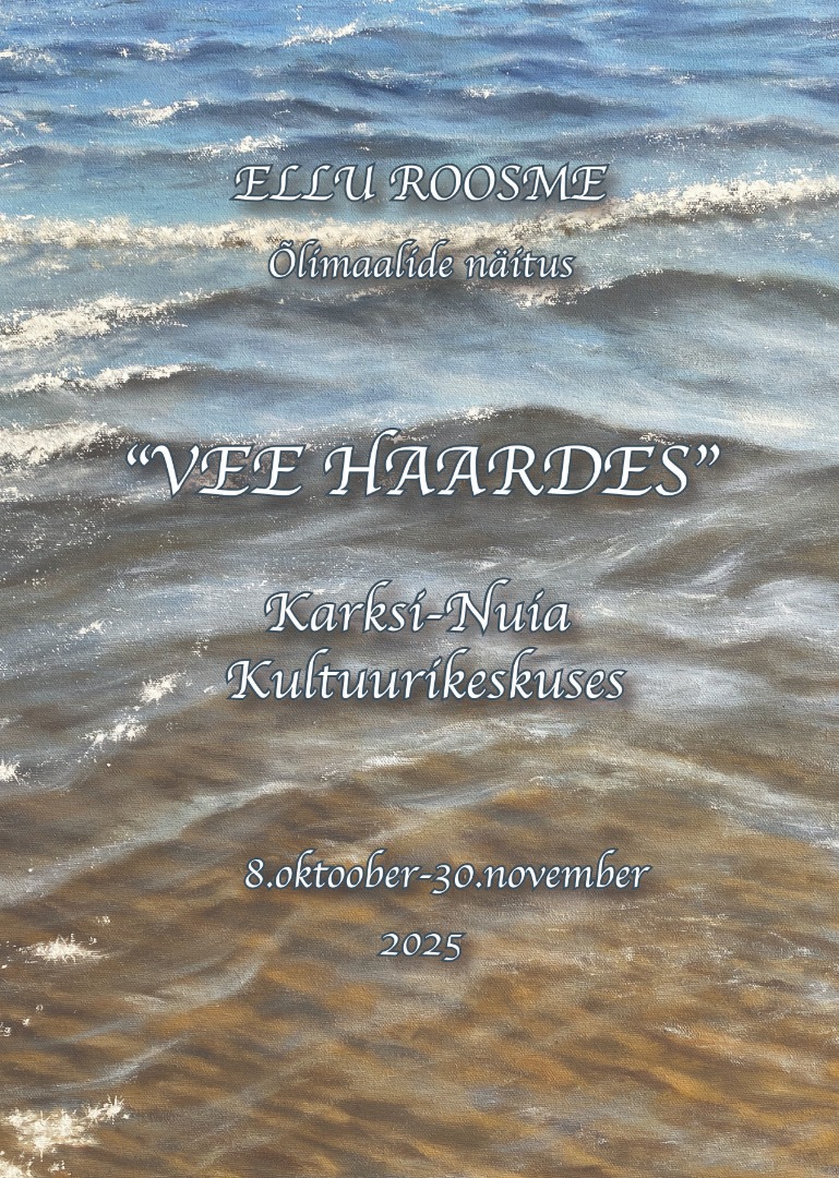 Ellu Roosme õlimaalide näitus "Vee haardes" 08.10.2025 - 30.11.2025 00:00Kultuurikeskuse II korrusel• Kõik selle päeva sündmused• Sündmuste kalender• Sündmuste arhiiv• Sündmuste RSS