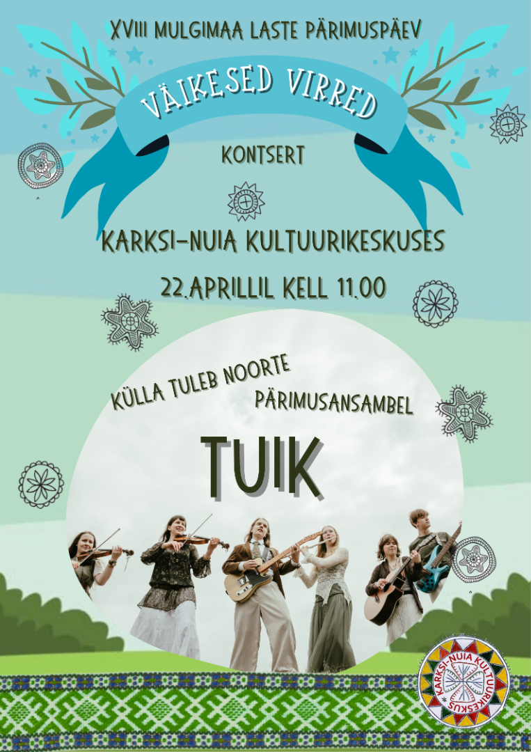 Mulgimaa laste pärimuspäev Väikesed Virred 22.04.2026 11:00Esinema tuleb uus noorte pärimusansambel „Tuik“. Kontsert on broneeritud algastme õpilastele ja lasteaia vanematele rühmadele.