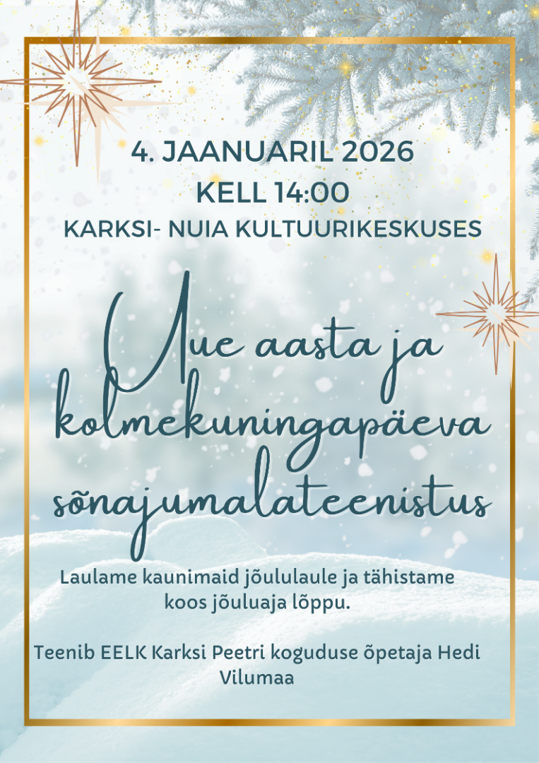 Uue aasta ja kolmekuningapäeva sõnajumalateenistus 04.01.2026 14:00Karksi-Nuia kultuurikeskuses!!! Tähistame koos jõuluaja lõppu. Laulame armastatud jõululaule! Teenib EELK Karksi Peetri koguduse õpetaja Hedi Vilumaa